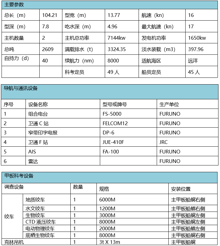 “实验3”科学考察船是1980年由上海沪东造船厂建造的3000吨级海洋综合科学考察船,截止2019年6月已执行航次153航次,海上作业近4000天。在海洋科学考察船舶中属于较大吨位船舶,拥有先进的电子海图、G.P.S.导航系统和雷达等导航、助航设备。2012年作为首批成员船加入“国家海洋调查船队”。近几年执行多个长远航次,如:马里亚纳海沟考察、中-巴莫克兰海沟考察、中-斯印度洋综合考察、西太平洋联合考察等航次。