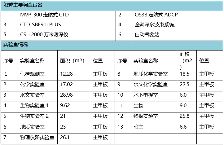 “实验3”配有水文、化学、生物、物理、地质等13个实验室。能够完成海洋物理、化学、生物、地质、海洋和大气环境等多学科和交叉学科的综合科学考察。