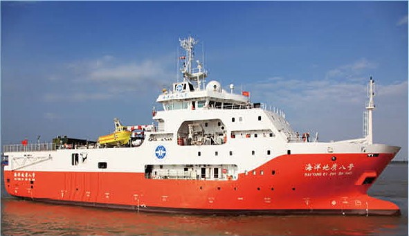 “海洋地质八号”船是广州海洋地质调查局的一艘具有先进三维地震测量功能的综合物探调查船,并预留6缆升级8缆小道距的条件。该船于2017年在上海造船厂建成,配备有三维地震采集系统、ORCA综合导航系统等专业设备。