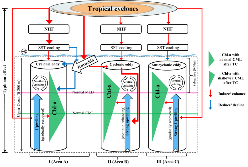 此项研究以南海2015年台风“莲花”为例,分析航次温盐和Chl-a数据、Argo温盐剖面、遥感数据及HYCOM模式数据,研究结果表明:台风“风泵”能引起甩涡流套的黑潮入侵,该黑潮入侵增强破坏其正面入侵海区原有的冷涡结构,抑制营养盐向表层的输运,并使营养盐在次表层富集,从而抑制表层浮游植物增长,促进次表层浮游植物增长。同时,该黑潮入侵能促进其路径左侧的冷涡的产生,产生以涡致上升流为主导(较之于风致上升流)的表层和次表层浮游植物增殖。此外,在台风增强黑潮入侵的海区,台风过境1周内海气热交换对上层海洋水动力过程的贡献甚至能达到近80%,并通过引起海表降温而间接调控Chl-a增长。