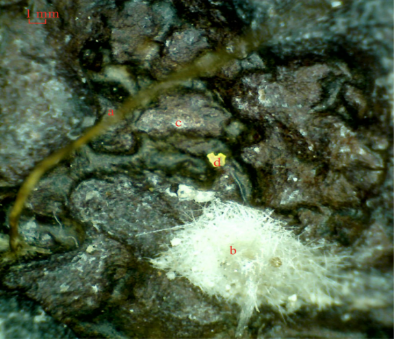a.深海管虫 b.海绵 c.菌席 d.黄铁矿