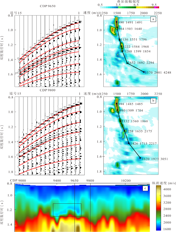 图3 CDP 9650(a)、CDP 9800(b)速度分析及和CDP 8900-15000(c)层速度剖面,(a)和(b)速度谱点(叉号)旁边的每组数据分别为该能量团对应的双程旅行时间、叠加速度和层速度