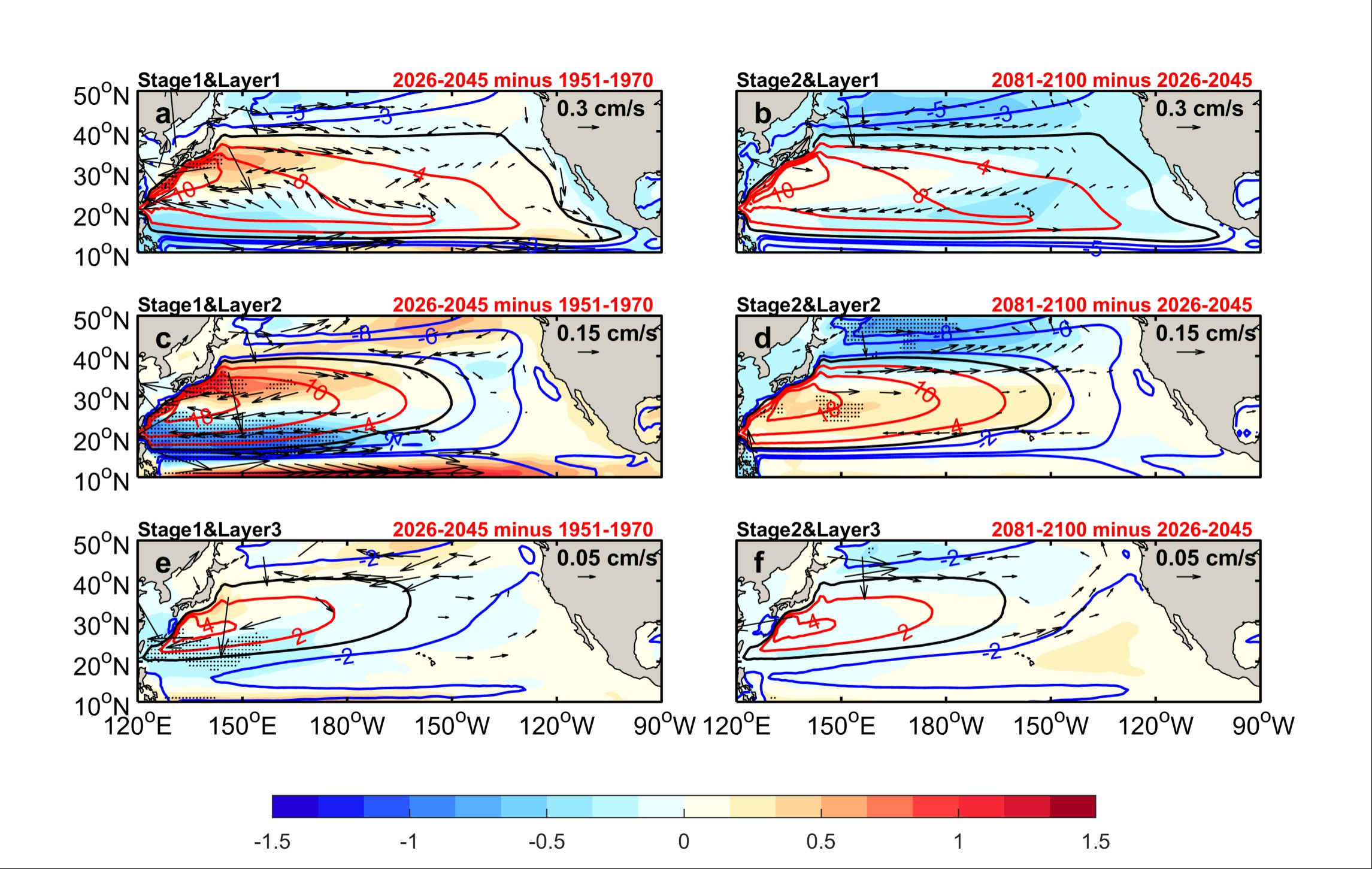 该研究指出,引起北太平洋副热带环流变化的主要因素为风应力与海洋垂向层结,并且在不同增温阶段作用各有不同。在GMST增长阶段,中纬度风应力旋度的负异常引起北太平洋上层1000米的环流增强,在GMST稳定阶段,层结变化通过位势涡度守恒关系引起主温跃层的环流变化。此外,研究表明风场变化存在很强的自然变率,会引起多模式及多样本间的环流变化的差异。此研究首次给出了低增温情景下北太平洋表层至中层的副热带环流的变化,有助于对副热带环流变异更全面的理解。