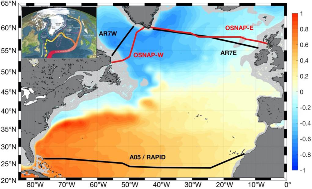 大西洋经向翻转流(AMOC)是全球海洋环流系统的重要组成部分,它主要由温暖的北向上层流系及寒冷的南向深层流系组成,其循环过程伴随大量的南北半球间热量、淡水再分配,对全球气候和极端天气气候事件起到至关重要的作用。在全球变暖和气候变化大背景下,科学界对AMOC减弱程度及其后果的讨论从未停歇。好莱坞灾难电影《后天》描述AMOC停滞引起全球陷入新冰河纪大劫难。全球变暖引起北极冰川加速融化,大量淡水汇入北大西洋,导致AMOC停滞,全球的冰河期开始,飓风、海啸、地震、洪水、极度严寒等一系列灾难。传统观点普遍认为高纬度海域水文特性变化与AMOC强度相关,而最新的水文观测资料显示全球上层海洋正在变暖且副极地北大西洋正在经历有记录以来最大规模的淡化,然而观测资料是否显示AMOC已经发生明显改变?
