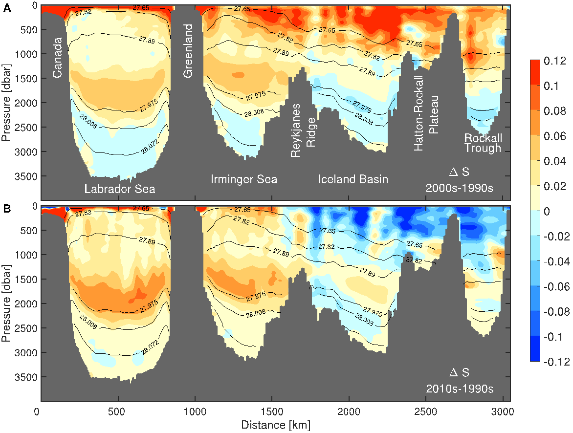 本研究基于北大西洋副极地和副热带的水文断面观测资料、RAPID和OSNAP浮标阵列资料、卫星地转流速资料及GECCO2海洋同化资料,综合分析了1990年至今的北大西洋水文特性变化及AMOC状态。结果显示,在过去近30年中,不仅北大西洋上层海水(0-2000米)特性发生了显著年代际变化,而且2000米以下的深层海水温度、盐度也在近10年显著增加;然而,与之形成鲜明反差的是AMOC强度在年代际时间尺度上保持稳定,这表明AMOC强度与北大西洋海水水文特性并非同步性,明显不同于传统观点。