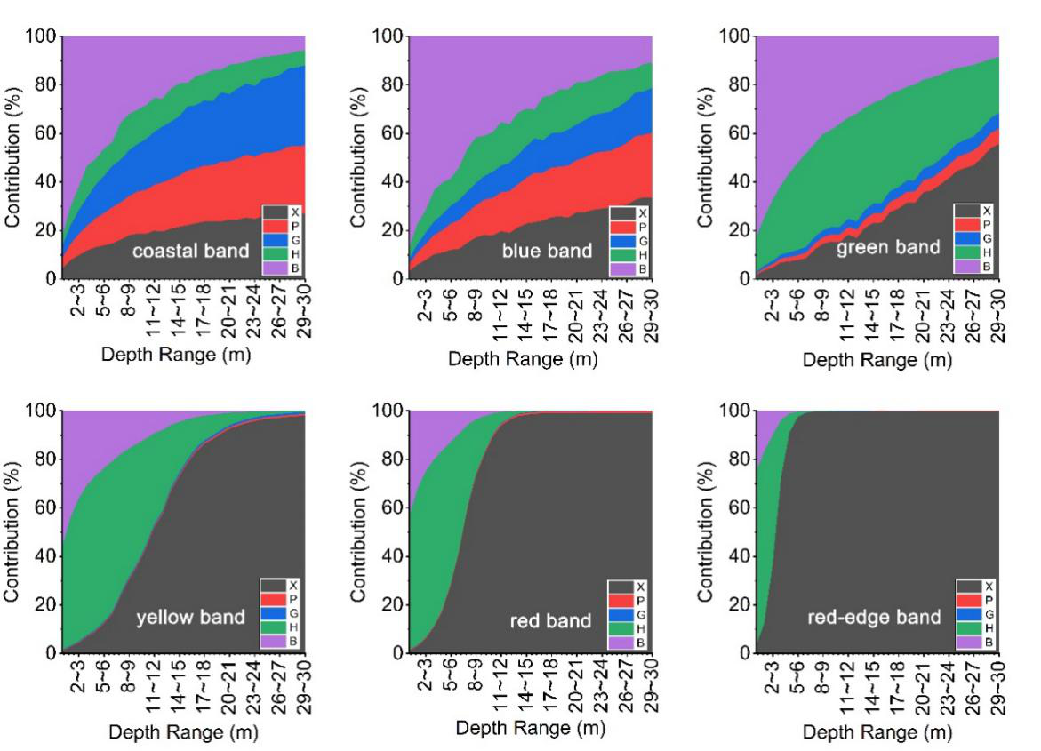 图1 在海洋一类水体环境下,光学浅水反射率模型的参数全局敏感性分析结果,以Worldview-2的波段设置为例