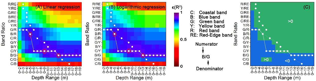 Stumpf等人(2003)的波段对数比值模型常被用于海洋一类水体的水深反演,但是目前的研究在选择该模型的波段组合时通常考虑具有较大穿透力的波段,忽略了不同水深范围内水深对不同波段反射率的敏感性差异。研究首先将LH-OAT参数全局敏感性分析法应用于一个半分析半经验的光学浅水反射率模型,全局敏感性分析结果表明,随着水深的增加,对水深变化敏感的波段从长波波段向短波波段变化。基于参数敏感性分析结果,研究建立了一个分段反演模型,能够连续反演从深水区域至浅水区域的水深。其中分段反演模型的子模型是不同波段组合的波段比值模型。为了能够根据遥感影像和研究区域自动确定子模型的形式及其适用的范围,研究还建立ADRA筛选机制。