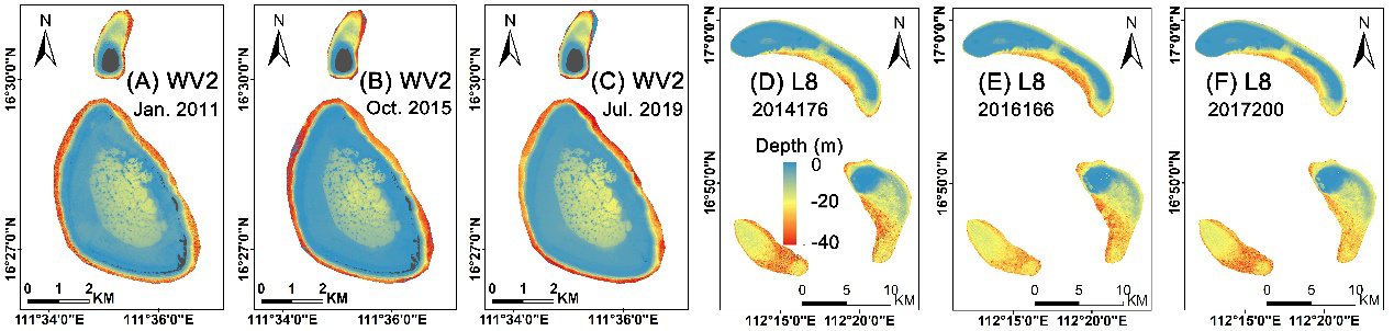 (D)-(E)七连屿和永兴岛的多时相水深反演结果(30m空间分辨率)
