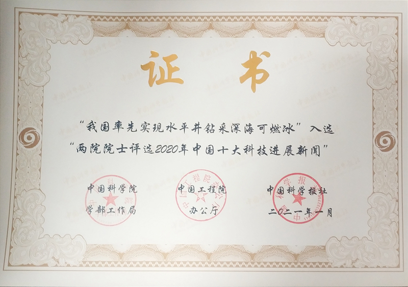 1月20日,由中国科学院院士和中国工程院院士投票评选的2020年中国十大科技进展新闻在京揭晓,中国地质调查局组织实施,广州海洋实验室主要依托单位广州海洋地质调查局承担,实验室参与完成的“我国率先实现水平井钻采深海可燃冰”成功入选。广州海洋实验室副主任、天然气水合物试采指挥部常务副指挥长秦绪文应邀在此次评选会上做主题报告。