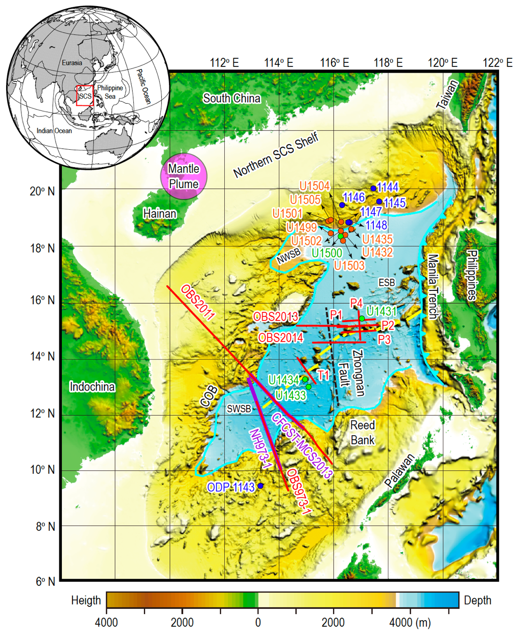 南海是西太平洋最大的边缘海,位于欧亚板块、菲律宾板块和印度-澳大利亚板块交汇处,是攻关地球边缘海形成演化过程重大科学问题的突破口(图1)。近年来南海各海盆的扩张年龄、地幔端元组成以及地壳厚度变化首次得到精确测量,但不同的地球物理与地球化学观测之间缺乏交叉验证的定量化统一模型。