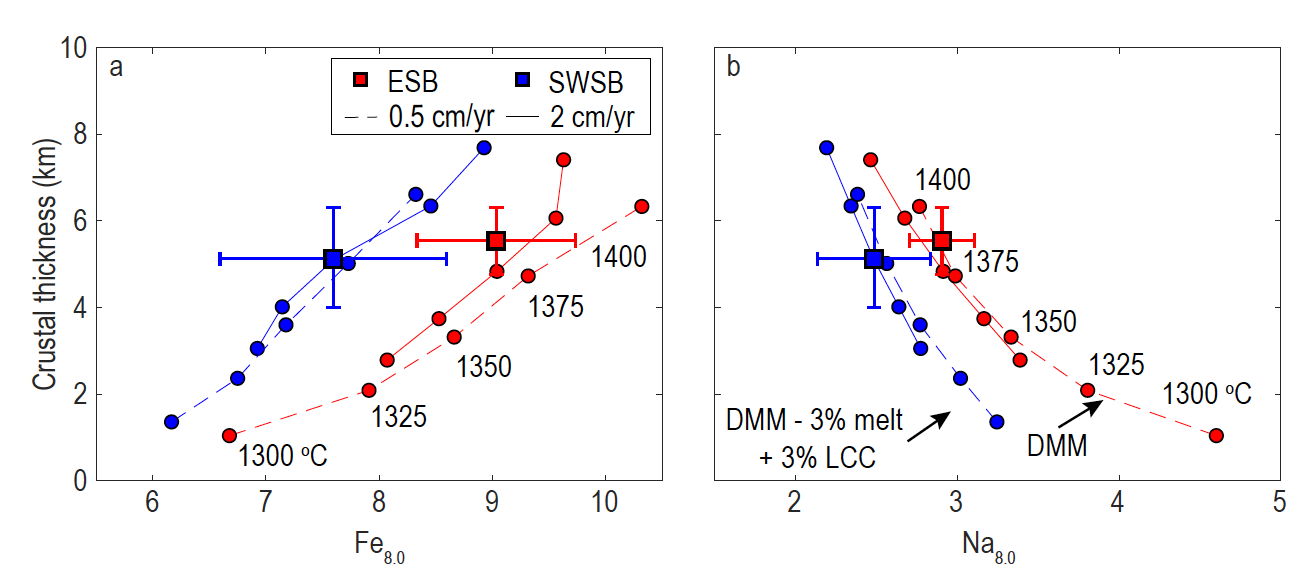 图2 南海东部和西南次海盆的地壳厚度、Fe8.0和Na8.0以及对应的最佳地幔温度和地幔组分。DMM:亏损地幔;LCC:大陆下地壳