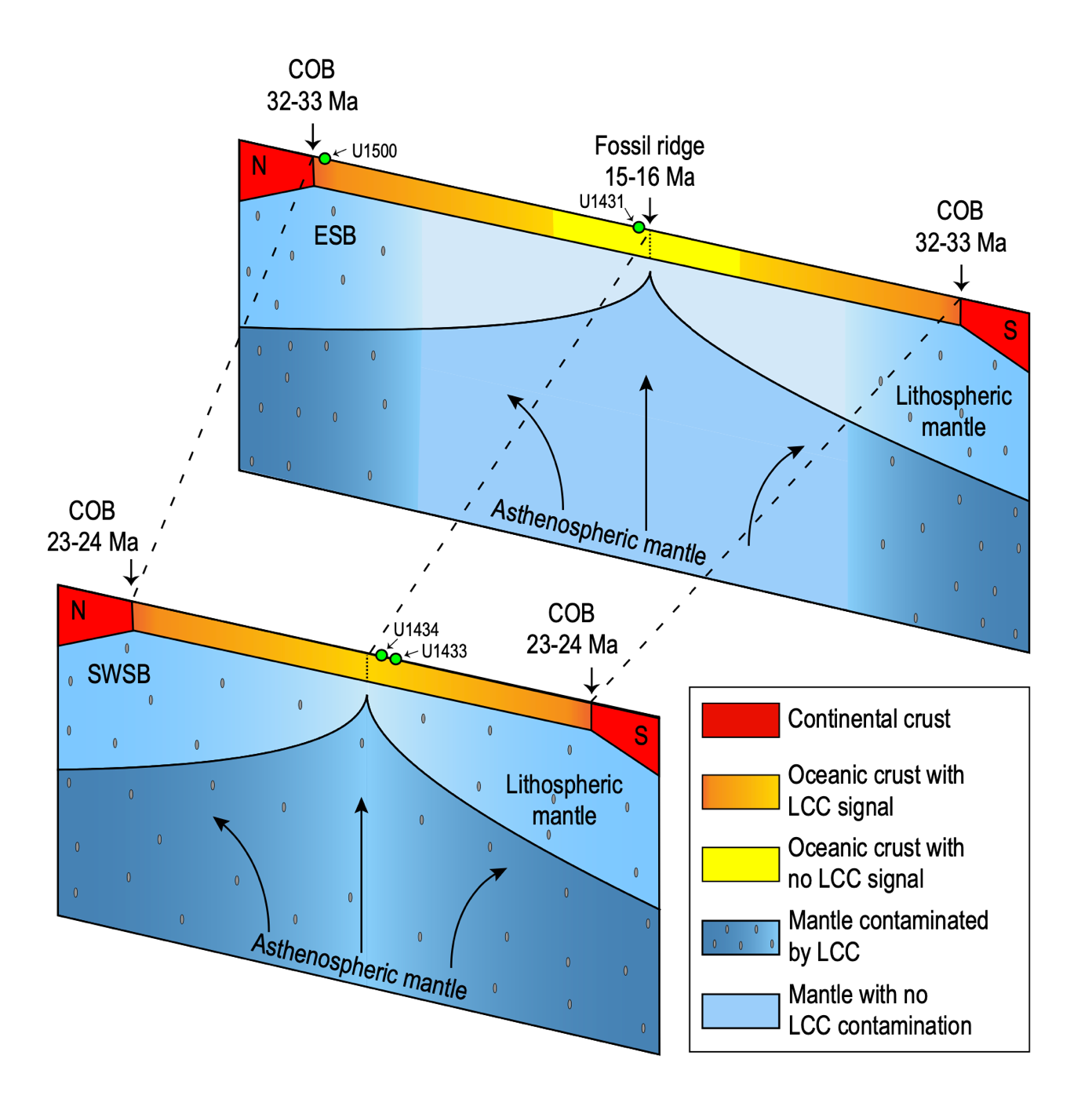 该研究创新地结合先进的热力学模拟与地幔熔融理论,以南海海上地震实验测定的地壳厚度以及国际大洋钻探获取的岩石地球化学特征为主要数据约束,建立了南海地幔温度、成分及其演化过程的定量化统一模型。模型结果显示(1)南海东部和西南次海盆的地幔温度基本一致;(2)东部和西南次海盆洋脊处岩石样品的地球化学特征差异主要受控于地幔组分(图2)。东部次海盆北部陆缘(U1500)的岩石地球化学特征与西南次海盆洋脊处(U1433、U1434)一致,表明扩张初期东部次海盆的地幔也受到了大陆下地壳的混染。由此,研究人员提出南海地幔演化的三个重要阶段:(1)在大陆破裂阶段,由于地壳拆沉作用,南海东部和西南次海盆的地幔都混染了少量大陆下地壳成分;(2)伴随着海底扩张的进行,被混染的地幔逐渐被上涌的深部正常地幔所取代;(3)由于海底扩张持续时间的不同,导致东部和西南次海盆的地幔组分存在差异(图3)。
