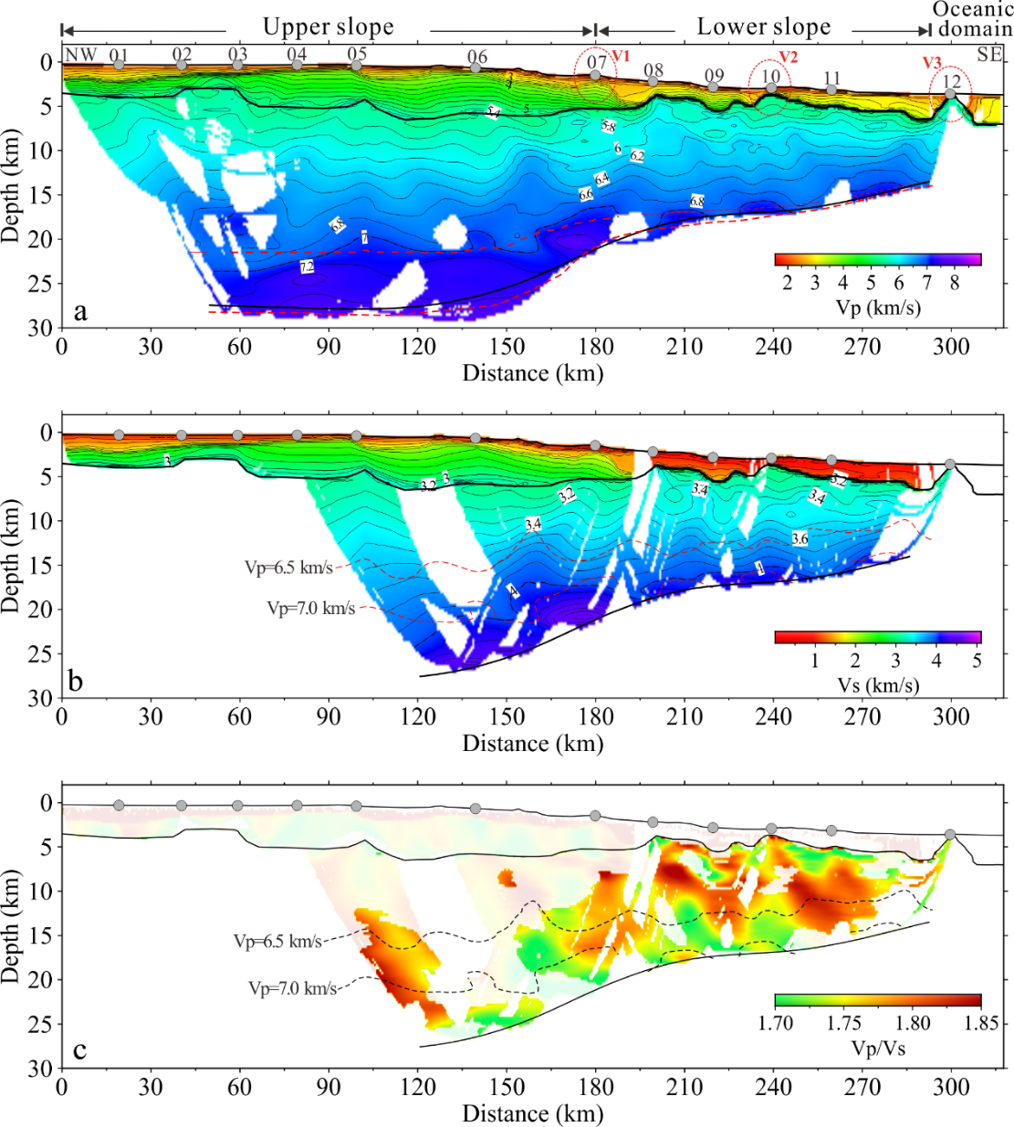 广州海洋实验室夏少红研究团队利用主动源OBS广角地震数据开展了纵横波速度结构研究,为深入认识南海北部陆缘岩浆活动及地壳伸展提供了重要信息。相关研究成果近日发表于Tectonophysics《构造物理》上。