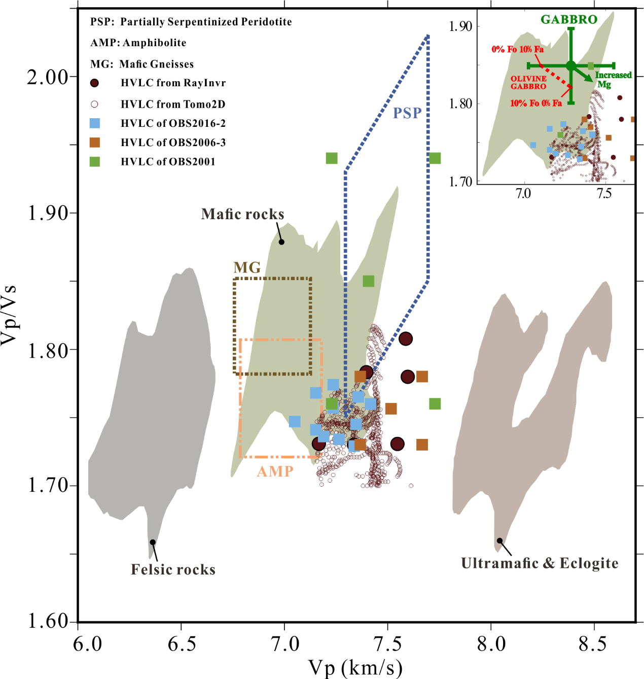 本研究收集了东沙海域采集的OBS数据(NS5测线),运用反演方法获取了P 波、S 波和Vp/Vs数据的结构模型。结果显示,下地壳高速体的Vp为7.0–7.5 km/s ± 0.05–0.25 km/s,Vp/Vs为1.70–1.82 ± 0.05,表明其成分以基性为主,为后期岩浆侵入形成的富镁辉长岩。