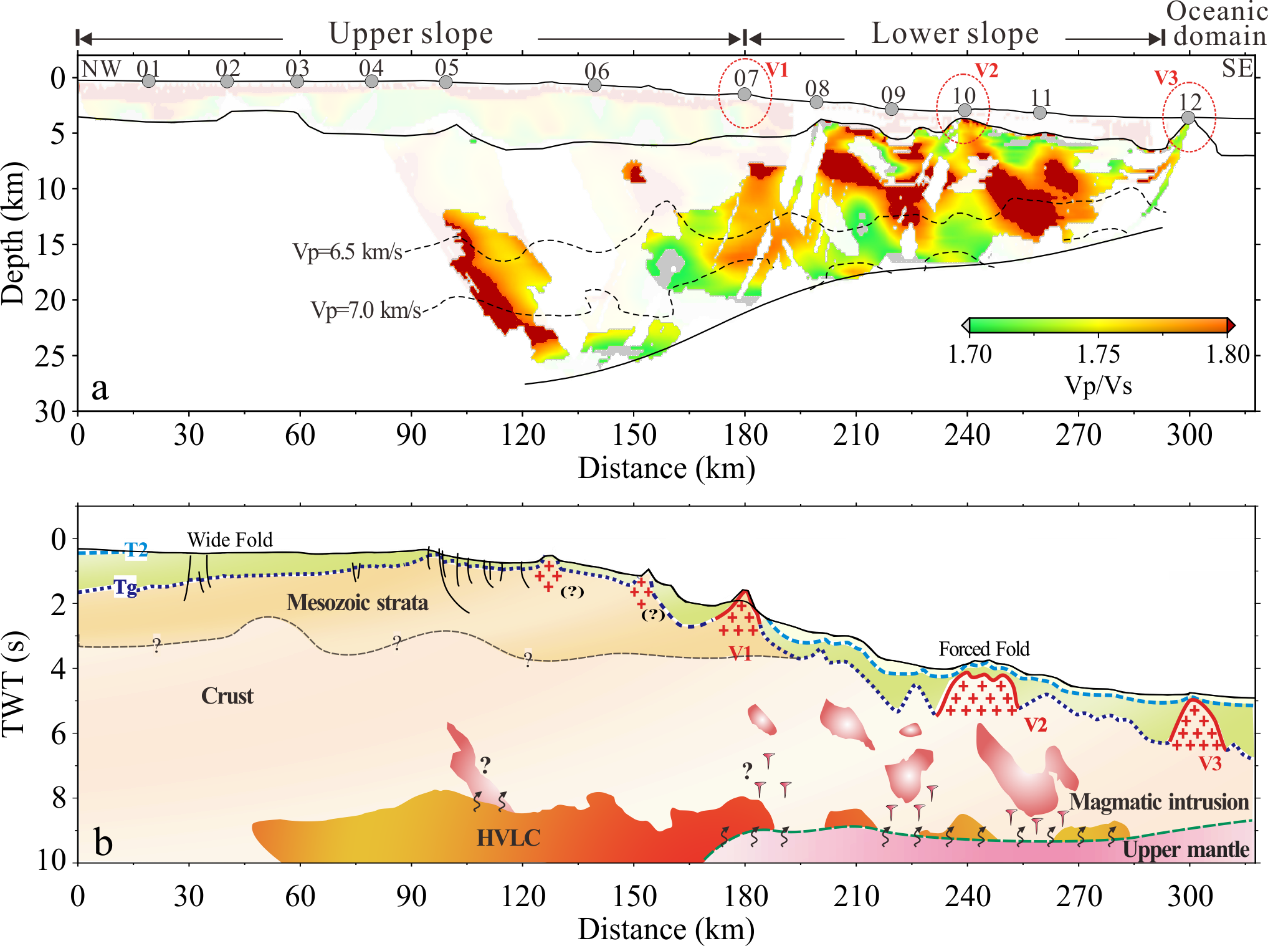 研究结果认为南海东北部洋-陆过渡带地壳拉张减薄程度剧烈,形成了大量伸展性断层,后期岩浆易沿断裂向浅部迁移,使得深部镁铁质岩浆侵入程度向海增大(Vp/Vs有向海增大的趋势),这导致下地壳高速体厚度在洋侧更薄。