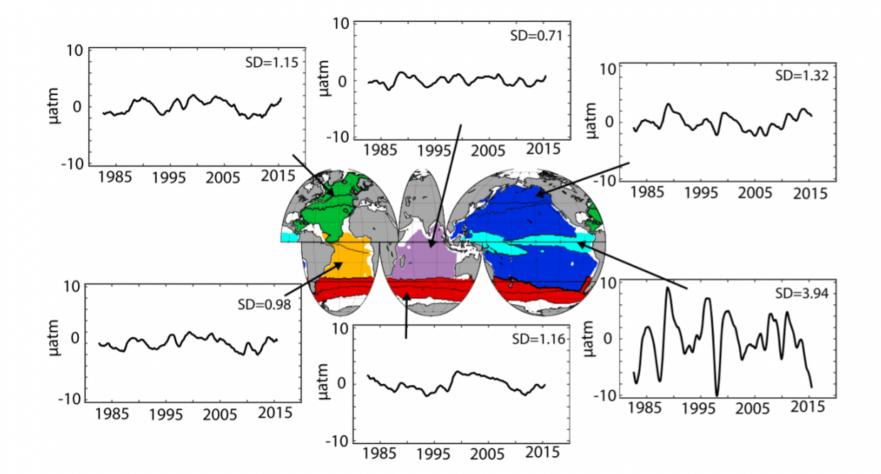 图1 不同海区海表pCO2(单位:µatm)的时间序列及其标准差。颜色代表分区。(来源:Landschützer et al., 2019)