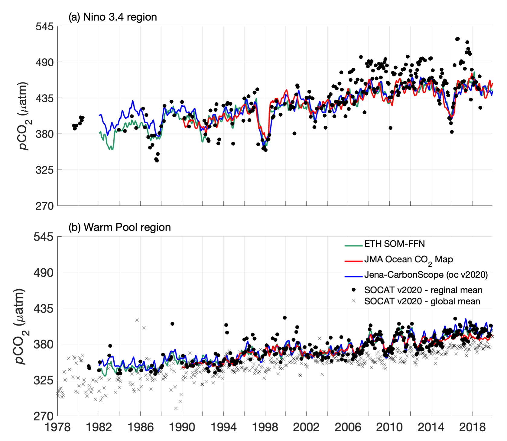 图2 (a) Niño 3.4区和 (b) 西太暖池区海表pCO2(单位:µatm)随时间的变化。黑点所表示的区域平均值高于叉号所表示的全球平均值。