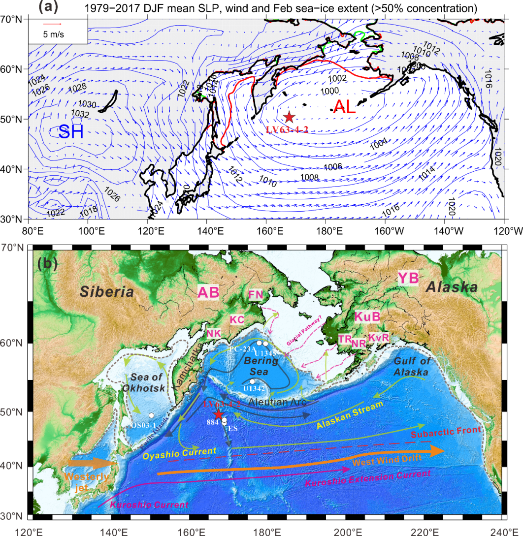 近日,广州海洋实验室深圳分部讲席教授团队,通过对亚北极太平洋海山区的沉积物岩心进行研究,重建了北太平洋沉积模式在高低纬气候过程的响应特征。相关成果以“Coupled Impacts of Atmospheric Circulation and Sea-Ice on Late Pleistocene Terrigenous Sediment Dynamics in the Subarctic Pacific Ocean”(晚更新世以来亚北极地区陆源沉积模式指示的大气环流和海冰耦合模型)为题,在地球科学领域权威自然指数期刊(Geophysical Research Letters)发表。