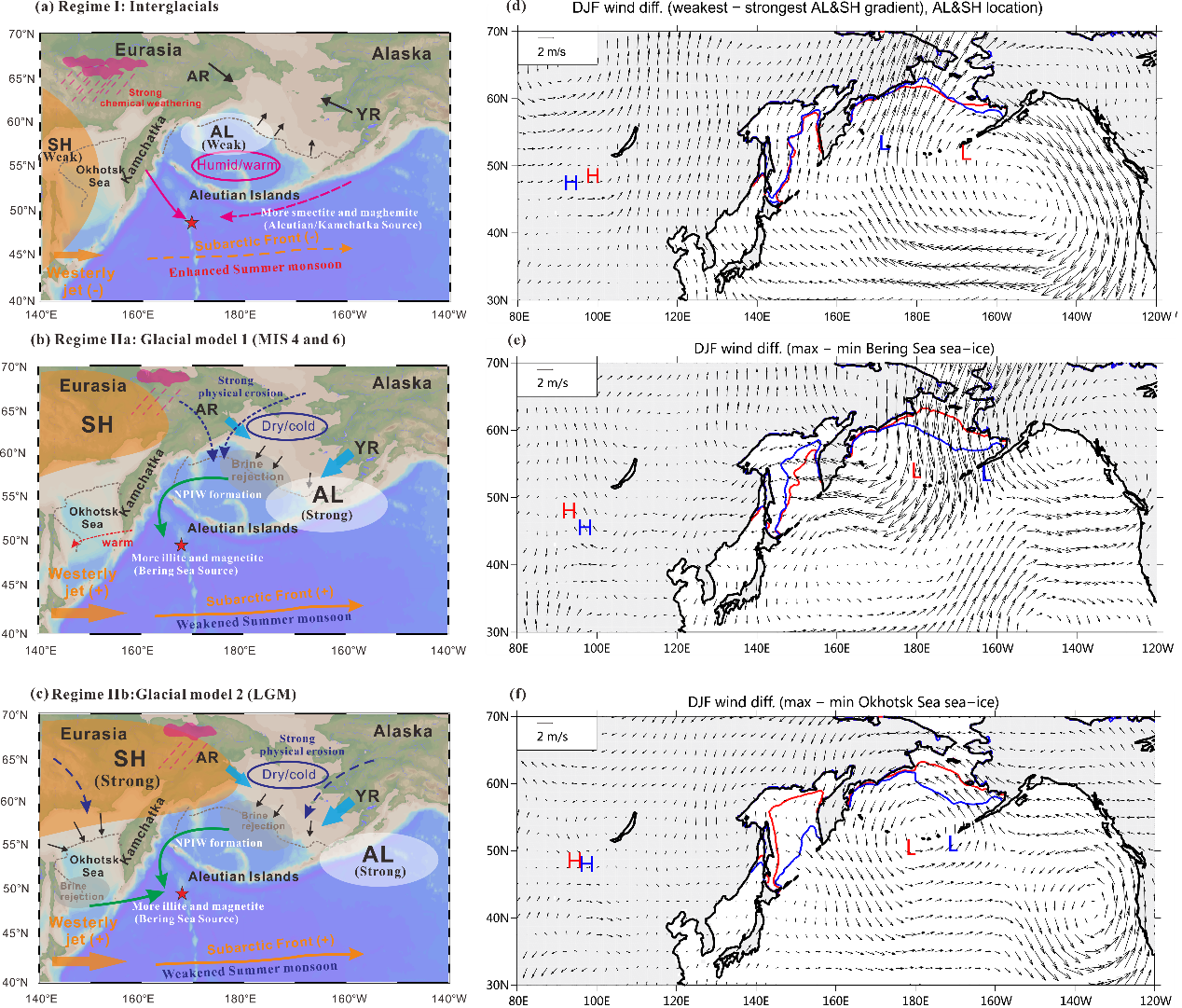 (a, d)机制I:暖期低纬度水汽向高纬度输送增多,阿留申和勘察加岛弧的化学风化作用减弱,海冰消退,白令海沉积物来源减少;(b, e)机制IIa: 氧同位素4和6阶段,化学风化减弱,白令海海冰扩张,NPIW在白令海地区形成;(c, f)机制IIb: 末次冰盛期(氧同位素2阶段),全球冰盖进一步扩张,西伯利亚高压增强,在鄂霍次克海和白令海海冰都开始扩张,并形成NPIW。