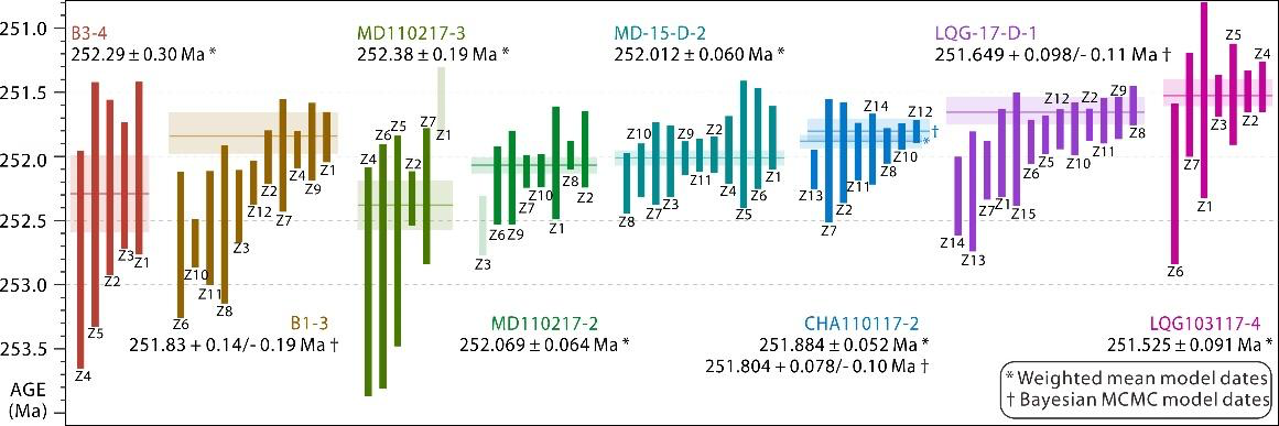 Qiong Wu, Hua Zhang, Jahandar Ramezani, Fei-fei Zhang, Douglas H. Erwin, Zhuo Feng, Long-yi Shao, Yao-feng Cai, Shu-han Zhang, Yi-gang Xu, Shu-zhong Shen*, 2024. The terrestrial end-Permian mass extinction in the paleotropics postdates the marine extinction. Science Advances.