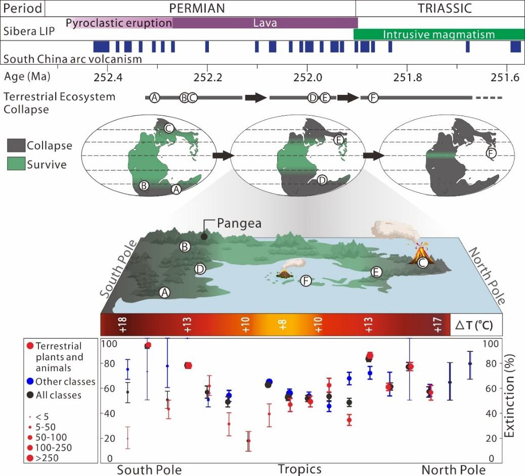地球生态系统在环境剧变时如何响应是科学界和广大民众普遍关心的问题,深入研究地质历史时期已经发生的生物大灭绝事件的机制和模式,对人类应对当前的地球环境变化有重要的启示意义。二叠纪末(约2.52亿年前)的生物大灭绝是地球有生命以来最严重的一次生物灭绝事件。然而,这次生态危机在不同纬度带的响应过程是否一致,长期以来并不清楚。以往的研究显示,二叠纪末期位于南方高纬度带的澳大利亚东部陆地生物大灭绝发生在大约251.31百万年前,相对海洋生物大灭绝发生得更早。那么低纬度地区陆地生物大灭绝与海洋生物大灭绝发生的时间关系是怎样的呢?