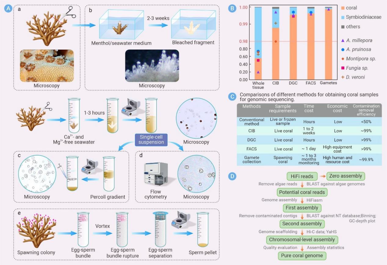 在这些工作中,研究团队聚焦造礁石珊瑚体内普遍存在的共生虫黄藻对基因组测序等组学研究带来的内源性污染的难题,通过整合实验优化与生物信息学分析手段,开发了针对性的技术框架,以利用珊瑚-虫黄藻共生体构建珊瑚纯净基因组。该技术框架首先利用化学胁迫诱导珊瑚白化、珊瑚细胞密度梯度离心、流式细胞分选等多种实验方法获得不含虫黄藻污染的珊瑚细胞,并通过扩增子测序分析比较以上实验处理前后获得的珊瑚DNA样本的污染情况。结果证实,未经实验处理的珊瑚样本提取的DNA仅有20-70%来自珊瑚,其余均为虫黄藻等共生生物及其它寄生生物的污染,而采用该技术框架的三种实验方法均可获得纯度高达99%的珊瑚DNA,较实验处理前平均提升55%。研究团队进一步对鹿角珊瑚物种的三个样本进行了三代基因组测序,并开发了一套生物信息学流程,以确保在测序数据组装过程中的高效识别和污染剔除。该生信流程将有参和无参的方法相结合,不仅利用已发表的海量数据准确识别污染序列,还借助序列特征聚类来辅助判别污染序列。由此,研究团队成功构建了质量远高于已发表基因组的珊瑚纯净基因组。该技术框架的建立突破了现有珊瑚基因组测序工作中依赖配子细胞的材料、资源及物种限制,仅利用珊瑚礁中随处可见的成体珊瑚即可获取可靠的珊瑚基因组信息,为推动大规模珊瑚基因组测序项目提供了重要的技术支撑(图1)。