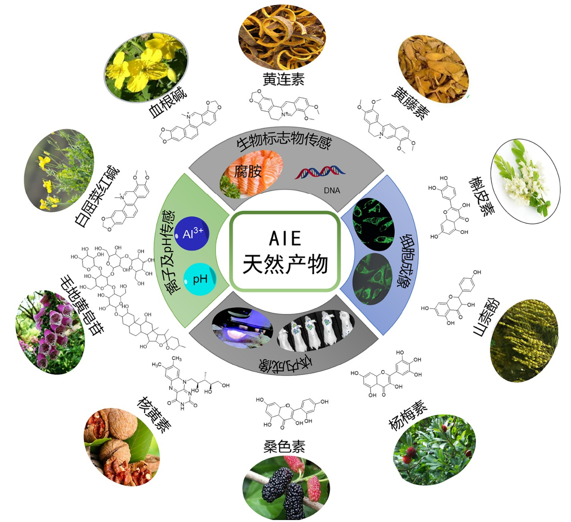 图1. 各类已报道的植物来源的AIE天然产物及其在荧光传感和生物成像中的应用
