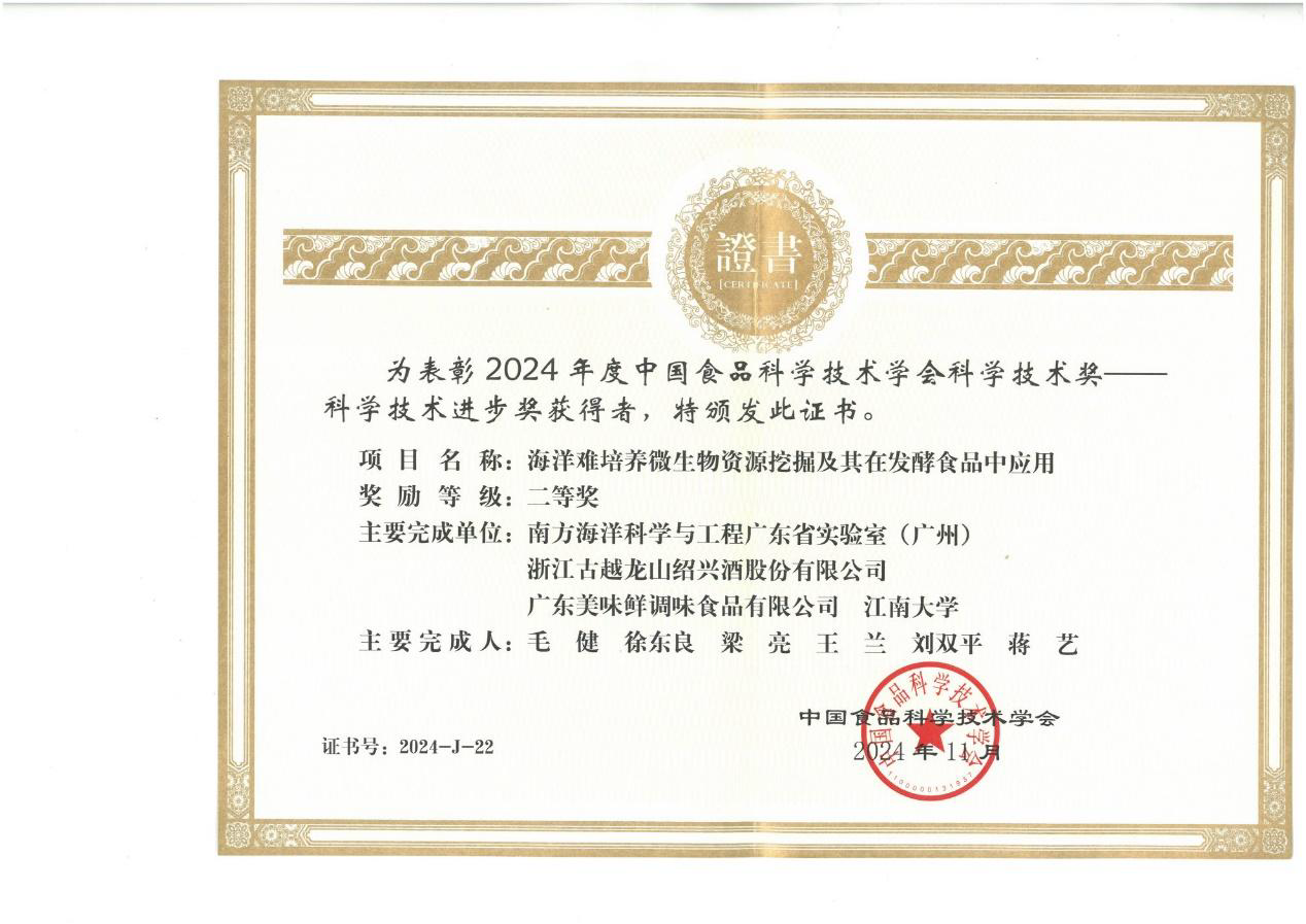 广州海洋实验室首次以第一完成单位获得食品领域的海洋研究科学技术奖励,是海洋生物资源高值化利用与装备开发广东省工程研究中心取得的重要科研成果。获奖项目由实验室联合浙江古越龙山绍兴酒股份有限公司、广东美味鲜调味食品有限公司、江南大学共同完成。通过开发海洋难培养微生物的原位高通量分离技术,项目团队发掘了大量难培养微生物资源,并成功将创新性微生物技术应用于发酵食品行业,显著改善了生产流程与产品质量,提升了食品安全水平,项目成果在合作企业中的应用取得了显著的经济和社会效益。项目成果为食品药品开发、生物制造和环境保护等领域提供了宝贵资源和技术支持,增强了食品安全性和出口竞争力,促进了相关产业的绿色化和可持续发展。