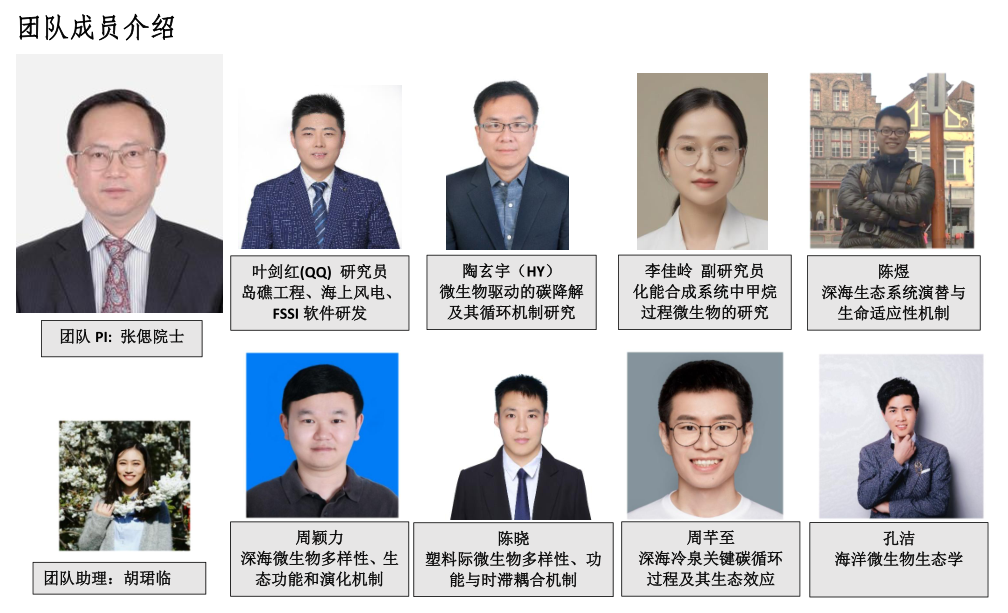 团队聚焦深海冷泉生态系统和远海岛礁深海生态系统核心科学问题,开展综合交叉和系统性研究。力争揭示极端深海生态系统的形成演化、化能合成作用、(微)生物共生关系以及群体连通性过程机制。致力建设我国原创、全球领先的国家重大科技基础设施“冷泉生态系统研究装置”,探究深海极端生态系统甲烷“源-汇”机制。
